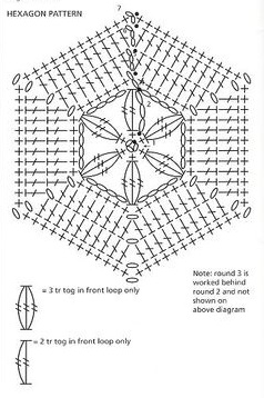 Очевидно, под цветочком ещё пара рядов из голубых ниток. Т.е. начинаете 6-угольник голубым. Отдельно - белый цветок. Накладываете его на голубой 6-угольник и следующим голубым рядом объединяете две эти деталюхи. Далее - по схеме, как уже вязали