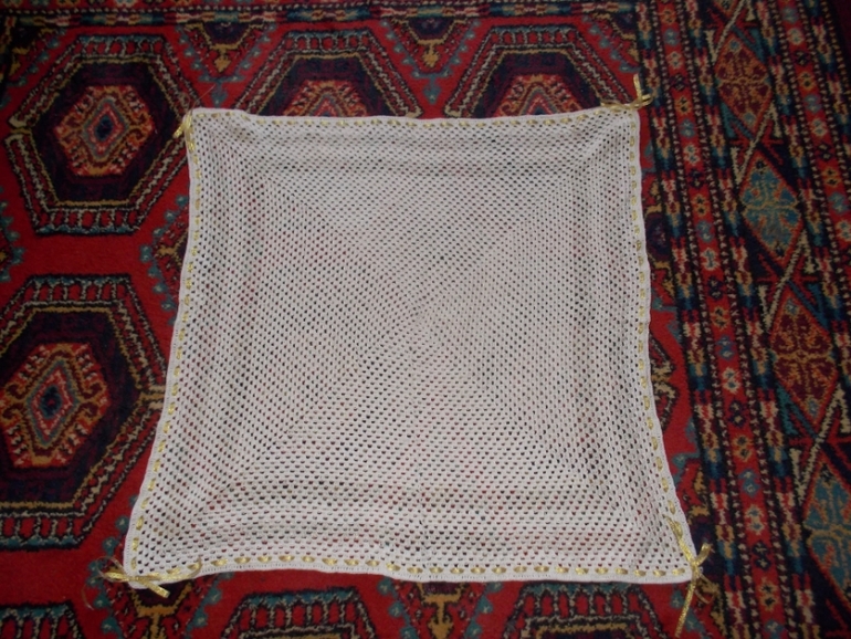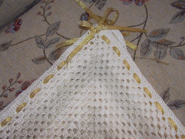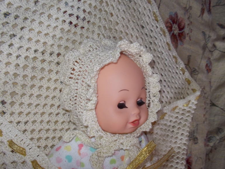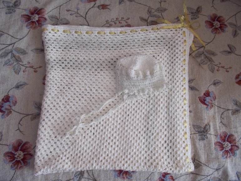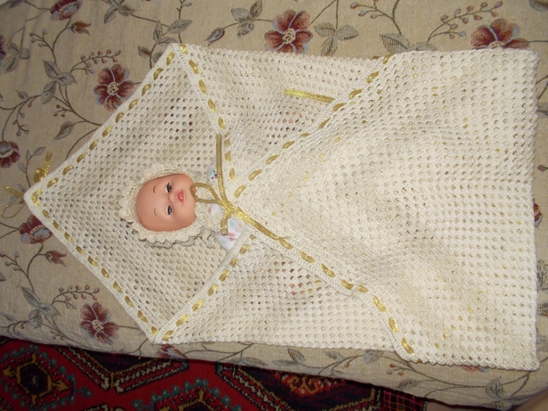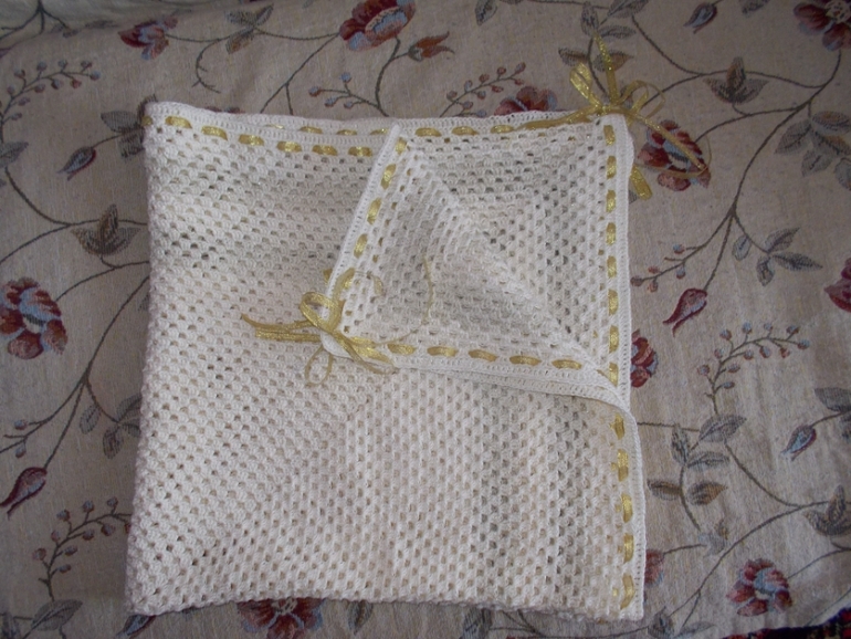 Пледы, одеяла, покрывала (ДЕТСКОЕ)Вот такой комплектик на выписку у меня связался.Вещь такого масштаба вязала первый раз,вязался он очень долго,т.к.не хватило мне ниток и не могла я их долго найти.Но вот наконец мой долговяз закончен.Выношу на Ваш суд. Тёмные полосы на пледе на самом деле такого же цвета,как сам плед,просто нитка с добавлением люрекса.