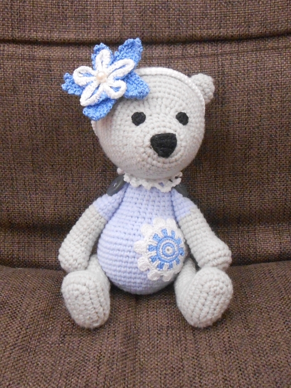 Ростом она 20 см. Связана из хлопка и акрила. Самостоятельно умеет сидеть. Повязка снимается.