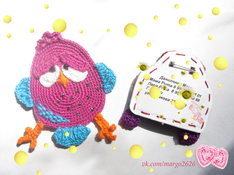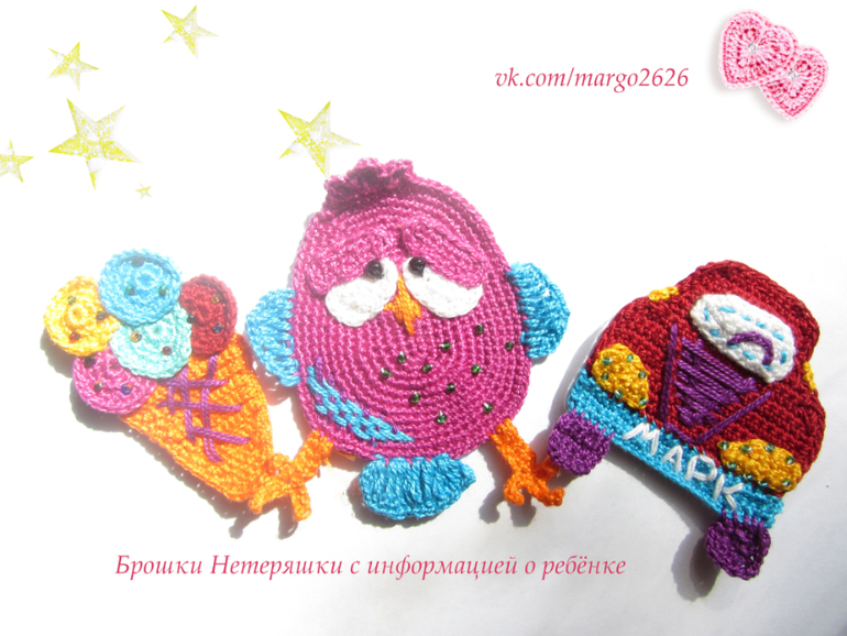 Вместо пресловутых записок с адресом в кармане, надёжнее украсить одежду ребёнка яркими, красочными брошками в виде смешных аппликаций.