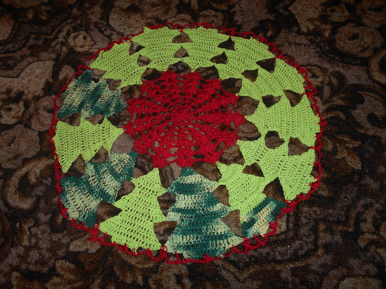 ничего - пестренько тоже прелесть:)) только я вязала центр поменьше и одна елка не влезала, пришлось переделывать ,а вы молодец!