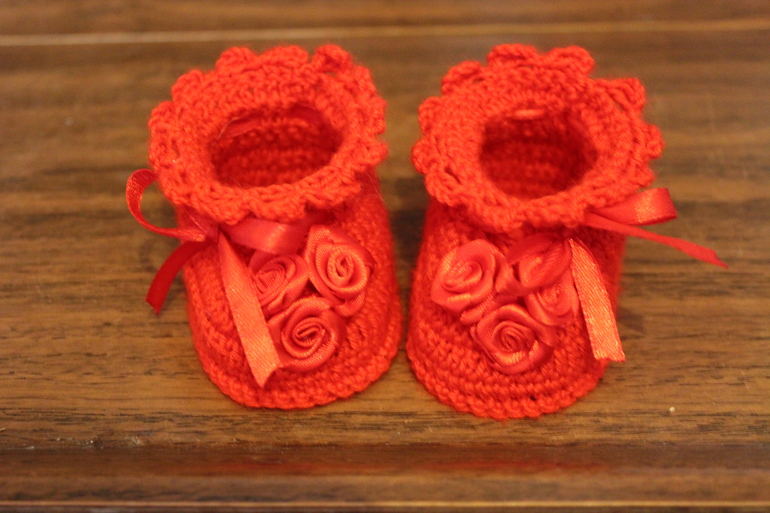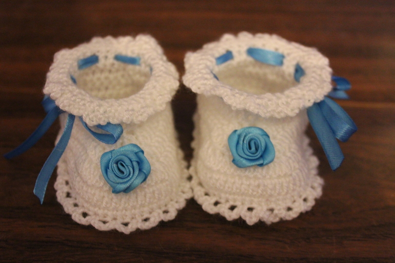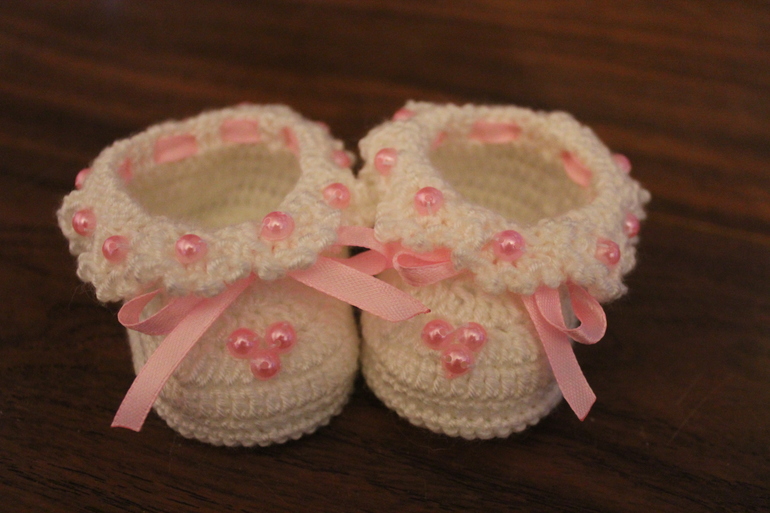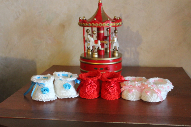 НАШИ ХВАСТУШКИСижу я значит такая, сижу. Смотрю на гору отданных детских вещей, многие из которых на мальчика. Так мне грустно стало!!! Бюджет совсем скромный, а так хотелось одеть свою девочку в нарядную одежку. И тут у меня бомбануло! Что ж у меня рук нет?! Хочешь красивую одежку так сделай! И тогда я твёрдо решила: в лепёшку расшибусь, а моя девчуля будет при параде! Первым пунктом были пинетки! Как же без нарядных, вязаных башмачков? Пришлось изрядно попотеть, но в итоге получилось очень даже мило!
