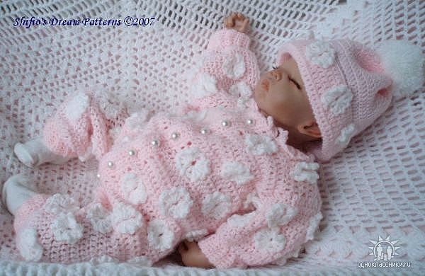 Если погуглить надпись на фото, то находится, что у первого комбинезона описание платное http://www.ravelry.com/patterns/library/sugar-daisy-baby-pram-pattern-crochet