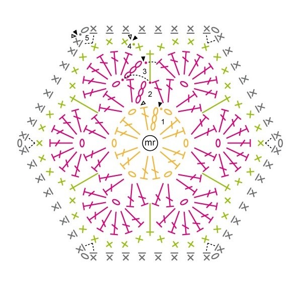 Получилось 58 мотивов, 5 из которых пятиугольные (по линии горловины и в подмышках), а остальные - шестиугольные.