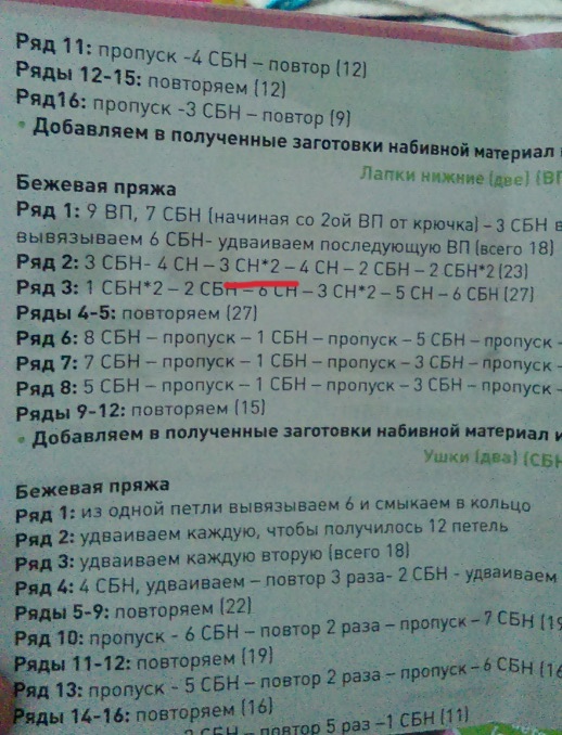 Учимся вязатьДевочки-рукодельницы, помогите, плиз, разобраться. Вяжу зайца, ох. Все шло не так уж плохо, но вот случился тупик. Не понимаю как вязать, что значит 3 СН*2? 3 столбика с накидом умножить на 2? Почему тогда не 6 СН? Еще в этом ряду должна произойти прибавка в 5 петель? Это где? Помогите, пожалуйста.