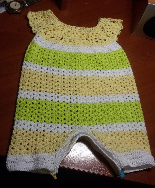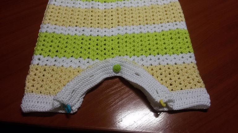 довязала! правда сглупила со стороной пришива пуговиц между ножек. Но будем надеяться, что малышке не помешает- все таки она еще не будет ходить)))