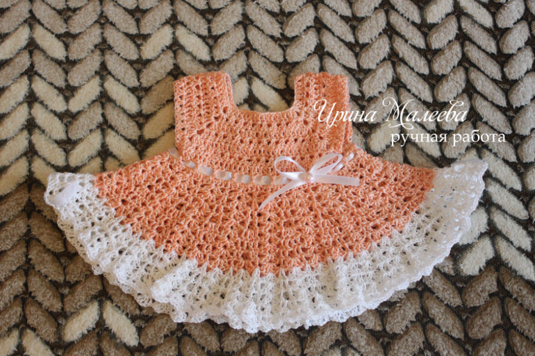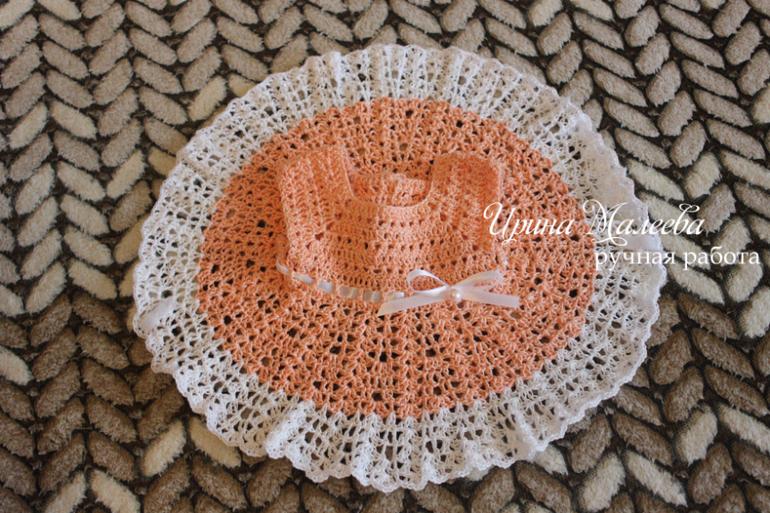Вот и связалось такое вот платьице для нее. Персиковая пряжа не знаю, какая, немного потолще Ириса и с блеском сильным, а белая внизу - Ирис. Крючок №1,75, расход пряжи не скажу, так как вязала из остатков. У куклы на руках липучки, я к платью тоже липучку пришила, теперь куколка как будто держит подол платья