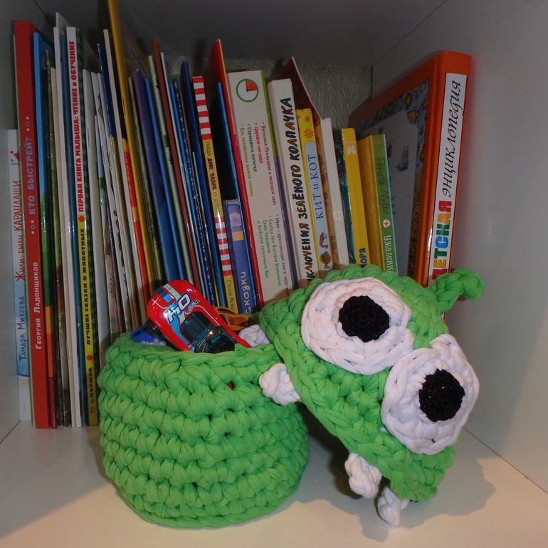 Мой сын обнажает Ам-няма,я ему вязала игрушку, а сейчас решила связать корзинку из трикотажной пряжи,очень полезная вещь! Вся мелочевка отлично в ней помещается😉