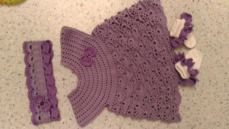 Платья, сарафаны (ДЕТСКОЕ)Платье на 6 месяцев из Alize Bella,крючок 2,5, повязка обвязана ирисом в 2 нити и носочки тоже обязаны ирисом