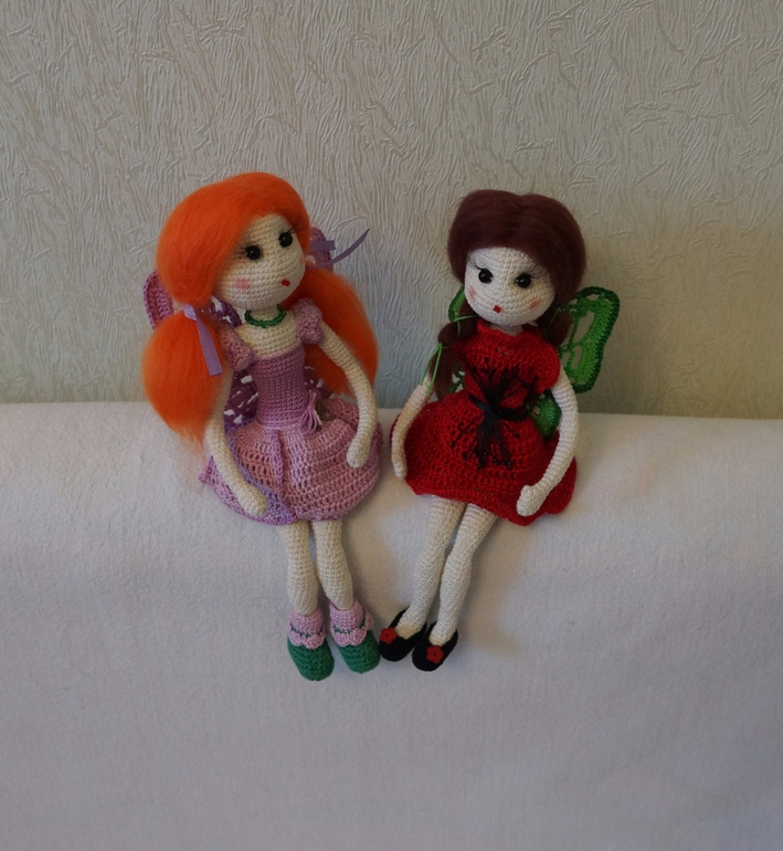 НАШИ ХВАСТУШКИБлуждая по просторам интернета, наткнулась на работы Сесиль Мери Баркер "Цветочные феи", и в моей голове засела мысль, что надо попробовать связать цветочных фей. И вот связала я двух фей: Фею Сирени и Фею Мака, что-то с рисунков, что-то свое. У данных кукол, новая схема, а так же использовала шерсть для валяния для причесок. Валяние для меня абсолютно новый вид творчества. Куклы каркасные. Высота 25 см. Конечно же будут и другие)))) Строго не судить))))))