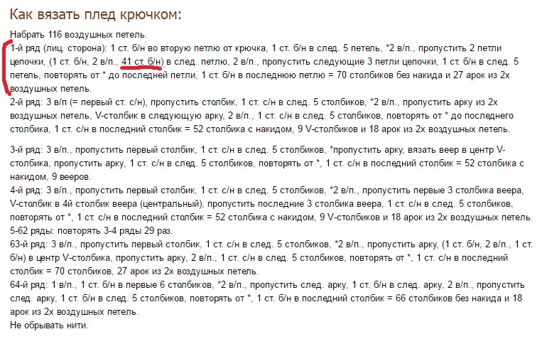 Маргарита, попроьовала связать мотив. Мой вывод: в скобках, где 41 вообще ненужная информация, откиньте ее. Может нужна для счета, а может опечатка. Не ломайте голову. Единственно потом пересчитайте количество получившихся арок. Второе: я бы вязала не столбиками без накида, а с накидом. А веера: вместо столбика с накидом-столбики с 2мя накидами. Как они обьясняют будет плотнее, пряжи больше уйдет. Но, боюсь, долго вязать прийдется, вам надоест.