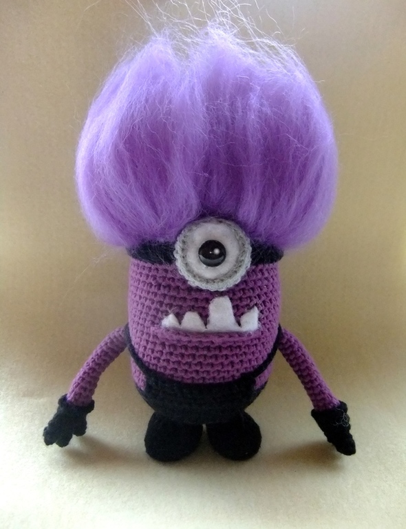 Вязала детям обычного желтого миньона, теперь хочу по той же схеме связать вот такого вот) но не пойму из чего сделаны волосы, конечно можно из обычной пряжи сделать, но мне вот этот вариант понравился. может кто знает
