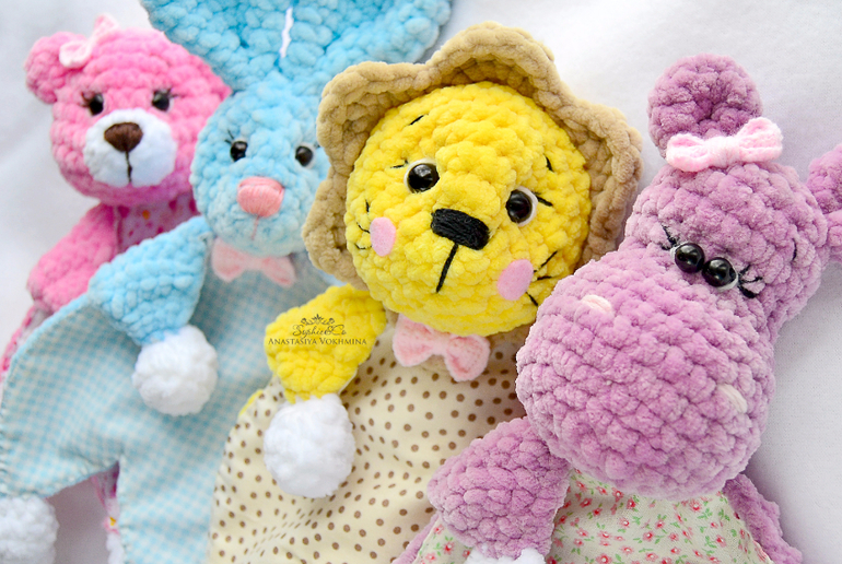 ИГРУШКИНу вот, наконец-то я готова показать Вам мои новые игрушечки-плюшевые комфортеры! Связаны из пряжи Himalaya dolphin baby. Рост от 28 до 32 см. Зайка самый крупный, мишутка самая маленькая) Ткань 100% хлопок. Головушки у игрушек меняют положение так, что комфортеры можно укладывать как на спинку, так и на животик) У всех малышей имеются самые настоящие хвостики. Все комфортеры в наличии)