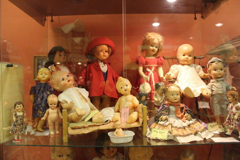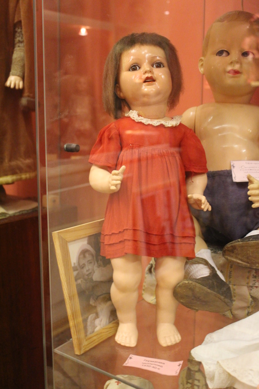 У этой куклы очень интересная история. Папа на войне получил письмо от своей любимой доченьки с просьбой привезти ей куклу в голубом платье и со светлыми волосами. Папа привез брюнетку в красном, единственную куклу, которую он смог купить в то неспокойное военное время. Купил, но мучился мыслей, что исполнил наказ дочери неверно. И написал письмо своей сестре, чтобы она как-то подготовила девочку. И та день изо дня рассказывала девочке, что как бы было хорошо, если бы папа догадался, что со светлыми волосиками куколка у тебя уже есть, а вот с темными ни одной, и что куколке с темными волосами очень бы подошло красное платье... И в итоге, к моменту, когда папа живой и невридимый пришел с победой домой и привез куклу - девочка была в полной уверенности, что именно такую куклу она и заказывала папе))) Довольная девочка со своей куклой позади на фотографии.