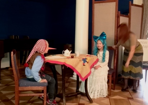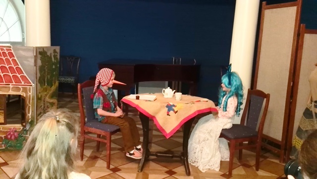 Итак, писателя и его образ жизни мы обсудили и перешли ко второй части - сказке. Для начала сравнительный анализ Буратино и Пиннокио, и пусть у обоих длинные носы, но это совершенно разные мальчишки, и дети это теперь твердо знают. Экскурсовод задавала вопросы-загадки, а детки с энтузиазмом выкрикивали ответы, а потом началось самое самое интересное. Наши дети играли в настоящем театре: с декорациями, костюмами, кулисами и аплодисментами. Надо было видеть их лица, светящиеся от счастья и восторга. До этого момента у нас была обычная хорошая экскурсия, но после этого она стала волшебной. Играть хотели все снова и снова, сценку мы повторили раз 5-6. Только одна Мальвина сомневалась и не хотела участвовать, но когда начала, ее сомнения развеялись и она была прекрасна, впрочем как и все остальные. Девчонки у нас были и Мальвинами, и Артемонами, и Буратино, а вот мальчики, конечно, только Буратино и Артемоном)