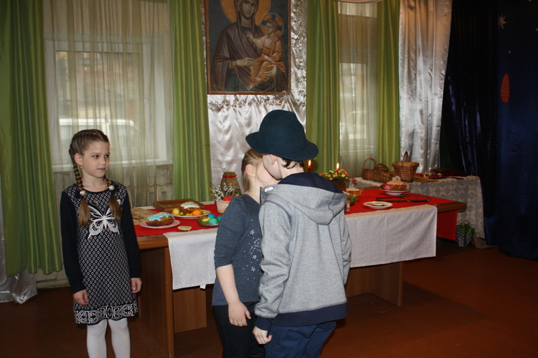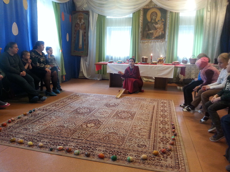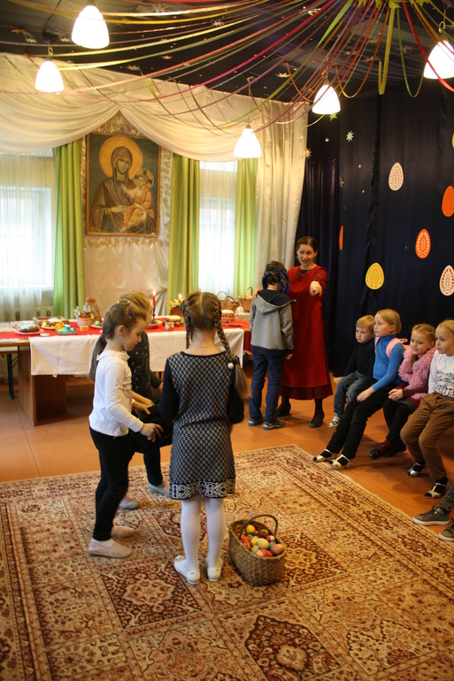 Программа была очень насыщенной и непогода не помешала нам:) Нас встретила Инна Владимировна и тут ..... путешествия начались! Поднялись на колокольню, там детки с помощью мам и Инны Владимировны исполнили Пасхальный благовест.Затем плавно переместились в каминный зал, там познакомились с традициями Пасхи .Никогда б не подумала, что на Руси окраской яиц занимались мужчины и что собственно яйца и куличи не имеют никакого отношения к Пасхе.
