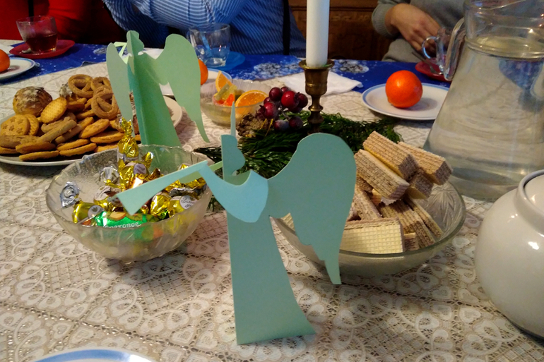 С Ангелами на столах. С правилами поведения (локти на стол не кладем, взрослых вперед пропускаем).