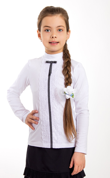 5. Блузка трикотажная Калинка, цвет белый с синим кружевом, размер 146, 95%хлопок, 5%эластан, 750р