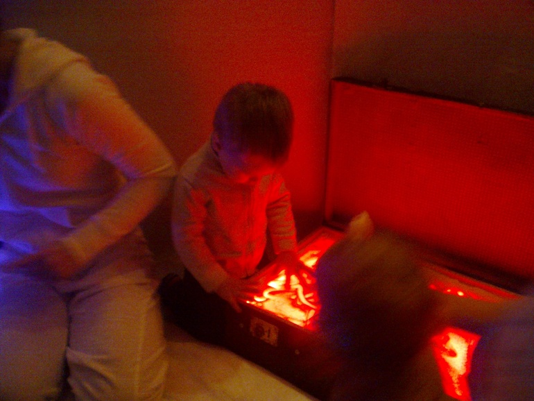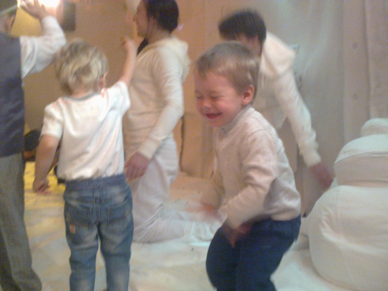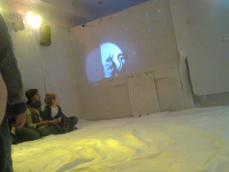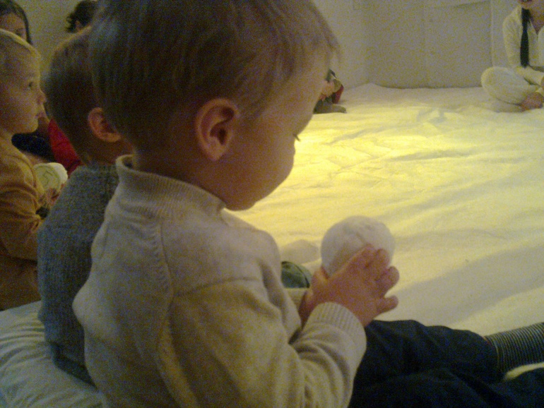 Деткам рассказали про теарт, раздали их места для сидения в виде подушечек белого цвета с номерком. В зал вела белая дорожка по темному коридору. Войдя в зал (небольшая комнатка) мы были ослеплены. Там все было белым бело. На полу, застеленному чем-то теплым и белым, лежали номерочки. Мы нашли свой и положили подушечку. Дима сначала сопротивлялся, тащил меня с собой на эту подушечку, но я удобно прилегла, обняв его за пояс, и он успокоился.