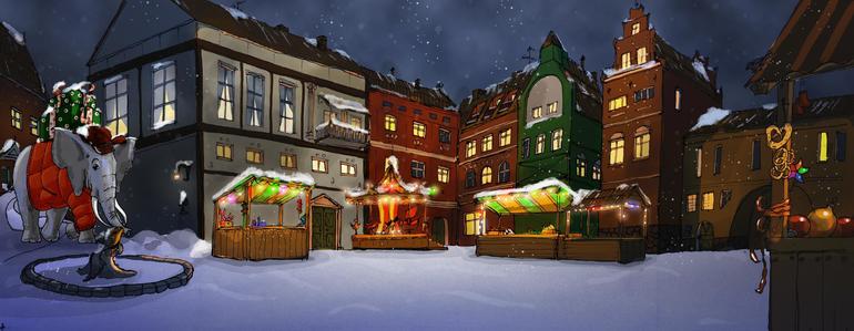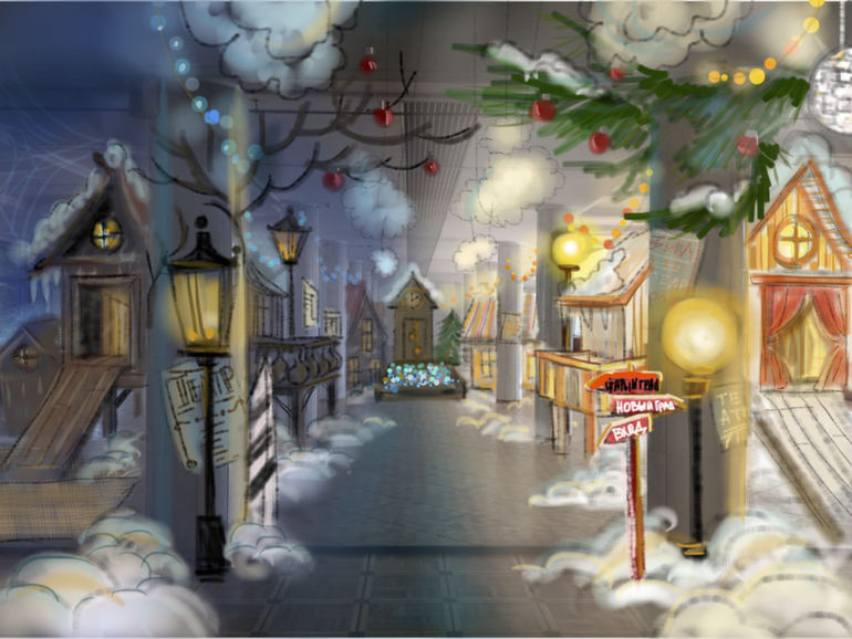 За 40 минут до начала спектакля гости окажутся на большой игровой площадке, представляющей собой предновогодний город с заснеженными, уютными улицами и оживленной центральной площадью. Детей встретят местные жители - жонглер, скрипач, дворник, бургомистр, трубочист, киномеханик, два симпатичных привидения. Можно будет посмотреть диафильмы в «Электротеатре», обучиться азам разных искусств, послушать историю сказочного города, пообщаться с каждым персонажем, сделать снимок в фотоателье и многое другое.