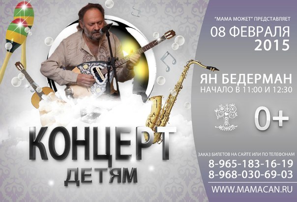 Концерты,народные гулянияПроект «Мама Может» приглашает малышей с родителями на концерт Яна Бедермана.