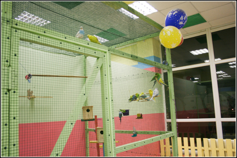 Вольер с волнистыми сорванцами. К ним можно зайти, но они весьма пугливы.