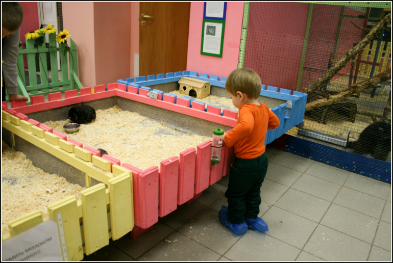 Зоопарк представляет собой зонированное пространство, оптимальное для пребывания множества детей и взрослых. Почти всех животинок можно гладить, кормить и обнимать. Малыши, в силу неумелости, чаще хлопают зверей, гоняют морских свинок и кроликов, пугают попугайчиков, а вот кормить под силу каждому. При входе встречает чудесная девушка-администратор, все рассказывает, кто где и кого чем кормить, какие правила.