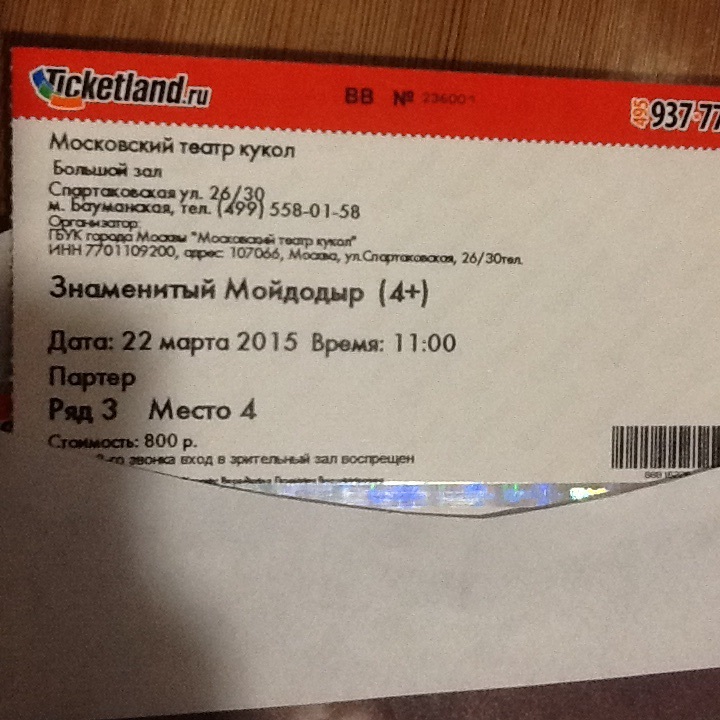 продам три билета на "знаменитый мойдодыр" 22.03.2015 в 11.00 Ряд 3,место 2,3,4 Покупала еще в середине февраля,а теперь поменялись планы и в это время будем в другом городе. Цена билета 800 р,указана на билете