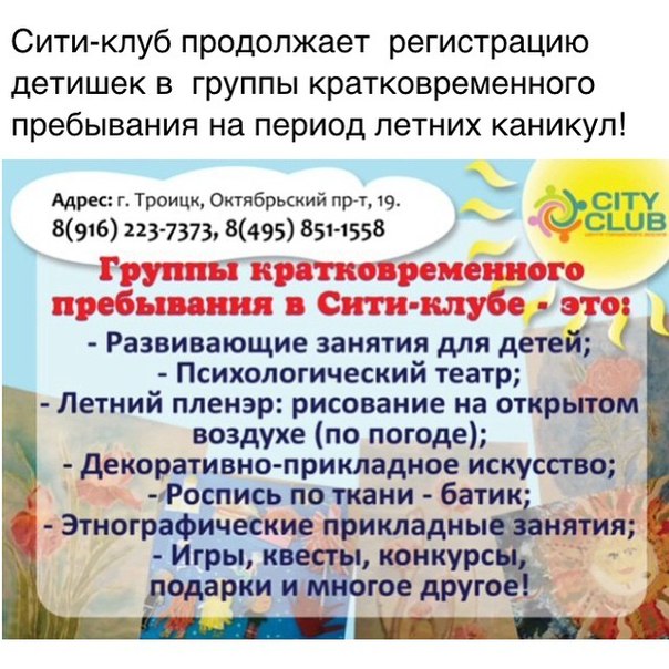 Сити-Клуб г. Троицк в Куда пойти с ребёнком в Москве? 11 лет Группа кратковременного пребывания, г. Троицк Развивающие центры и мастер-классы Посмотрите еще 20 записей на эту тему Отменить Ответить 19.05 Практический семинар по совместному игровому взаимодействию для мами малышей Лекция “Как устроены наши дети? Биологическое и социальное” Чаты Беременных Выберите чат: Январята-2026 Февралята-2026 Мартята-2026 Апрелята-2026 Майчата-2026 Июнята-2026 Июлята-2026 Августята-2026