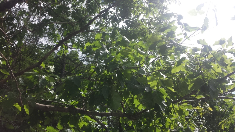 Потом побрела я по Ломоносовскому проспекту в сторону МГУ, по дороге валяется много желудей. Стала присматриваться к деревьям, не могу понять, откуда они взялись, классических дубов не видно, а потом вспомнила, что читала про другую разновидность с немного другими листьями. И тут таких дубов навалом, если не ошибаюсь, это дуб болотный.