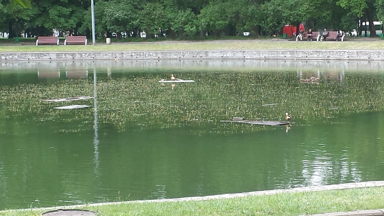 В центре парка небольшой круглый водоем с бывшими домиками для уток.