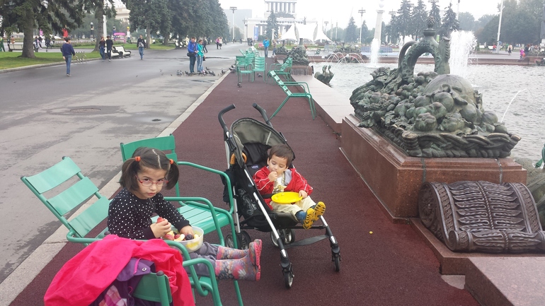 1. Мне САМОЙ там очень нравится: архитектура зданий, фонтаны, парк с прудами в дальней части, возможность из ВДНХ пойти в Останкинский парк (были там в прошлом году, тоже очень понравилось, но это отдельная песня). Тут есть все, чтобы лично мне (подруга зовет меня разумный эгоист)))) получить огромное удовольствие от прогулки, а не просто созерцать детей на площадках. Но и дети тоже довольны, потому что...