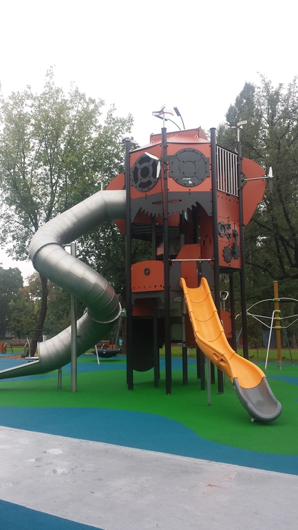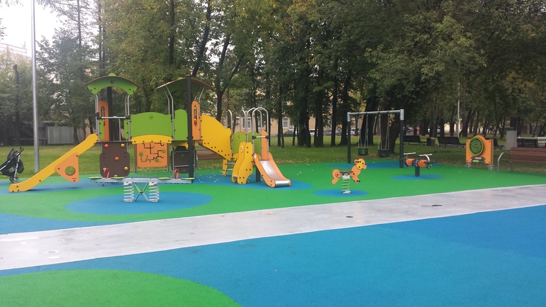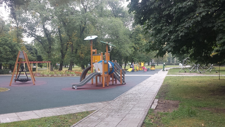 Папа наш по работе двинулся на книжную ярмарку, ну а дети настойчиво требовали площадку! Интерактивная карта довела нас до большой разновозрастной площадки "Фантастический город" (ссылки на площадки даю, чтобы легче их было найти по карте). Между малышковой зоной и более старшей есть бетонная полоса. Меня это не пугает (наверное, потому что никто из моих еще там не падал), но здесь недавно при обсуждении площадки в Музеоне она была отмечена, как недостаток. И действительно, не понимаю, зачем так сделали. В остальном, все очень даже неплохо.