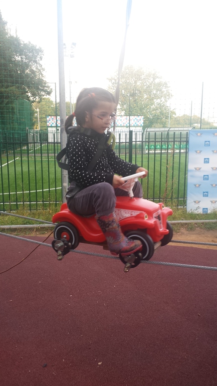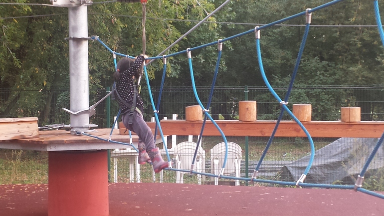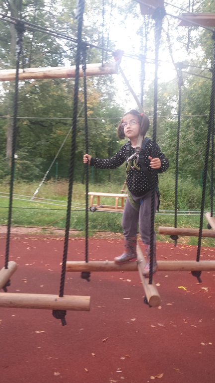 Для детей ростом от 100 до 140 см доступен нижний уровень, за 300 рублей можно 2 часа лазить. При покупке билета нужен паспорт. Так как я уже много читала в интернете про этот городок и потом увидела все сама, поняла что нижний уровень (зона паркура) практически безопасен, и за Дашу я была спокойна. Для других уровней, на мой взгляд, нужен инструктор, особенно если вы в первый раз в подобном парке. Народу было мало, и инструктор уделил нам достаточно внимания, сам, без каких-либо просьб, одел на Дашу инвентарь и "подсоединил" к системе)) Я с младшим в коляске зашла внутрь, иногда приходилось помогать Даше, все таки ее рост (около 107 см) еще не позволял ей спокойно проходить все препятствия. Проблем было две. В некоторых переходах межу препятствиями карабин со страховочным ремнем не удавалось спокойно передвигать, он застревал. А в силу своего роста Даша не доставала до самого карабина, чтобы его передвинуть. Я тоже не дотягивалась, стоя внизу, да и Илюха все пытался вылезти из коляски и поучаствовать в процессе. Один раз на помощь пришла инструктор и несколько раз ребята, которые были выше Даши и находились рядом. Вторая проблема - Даше иногда не хватало размаха руке, чтобы схватиться за ближайшую веревку. Но в целом ей понравилось, во второй раз все прошло быстрее. А потом пора было возвращаться к папе, хотя осталось еще минут 30-40 до конца оплаченного времени.