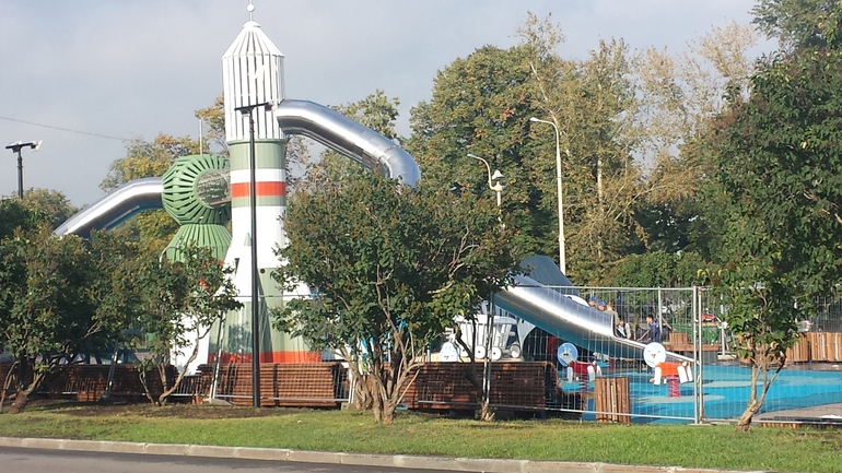 По дороге посмотрели на Буран и детскую площадку Космос, которую почти уже соорудили рядом к Дню города, жаль, она была еще огорожена.