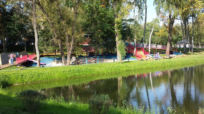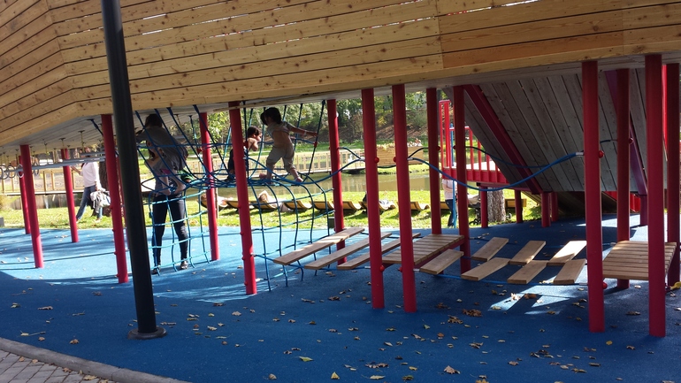 Площадка детям понравилась, можно не только полазить, но и просто с криками бегать по помосту. На фоне всей этой красоты розовая пластмассовая горка смотрится неожиданно))))