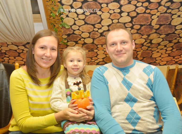 На фотографии самая младшая участница нашего праздника, красавица Майя, со своими любящими родителями. Это очень счастливая и дружная семья. Майе два с половиной года и у неё получилась очень красивая тыква и вкусные фруктовые шашлычки с приведениями.