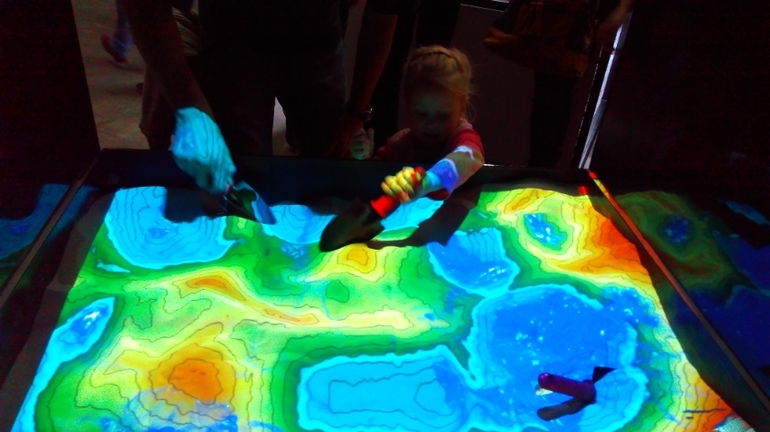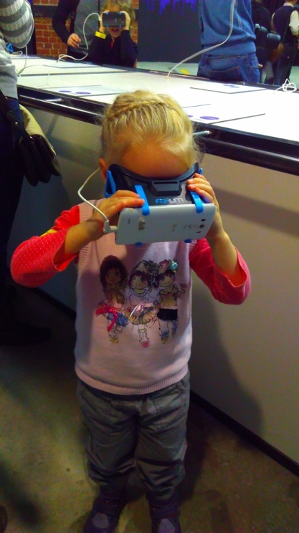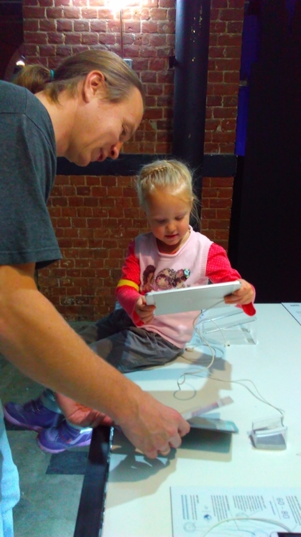 Расскажу про то, что особо понравилось лично мне. Есть там такая штука, которая проводками крепится к ладоням и в зависимости от твоего настроения показывает цвет. У нас троих у всех был разный цвет, меня устройство сдало с потрохами, выдав красный, а значит цвет волнения и раздражения. Я пыталась тщательно скрывать свое настроение от семейства, но не вышло. Любопытно было глянуть на 3 Д принтер, да и вещи на нем сделанные, тоже интересные. Ну и, конечно, я разделила Катюшкин интерес к дополненной реальности.