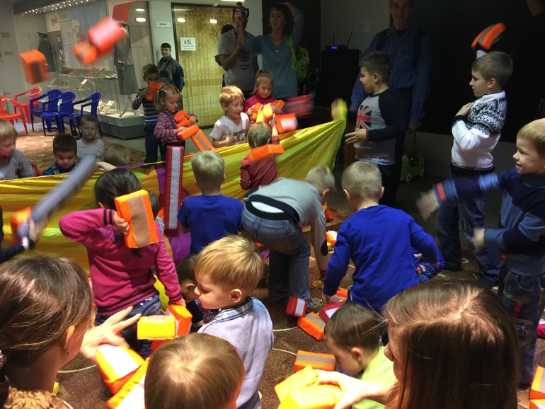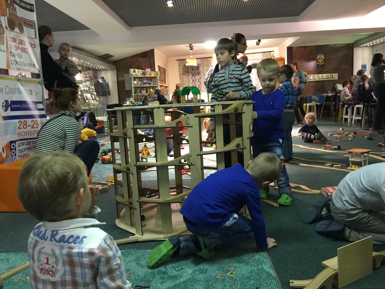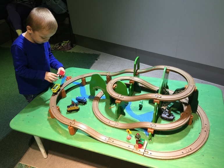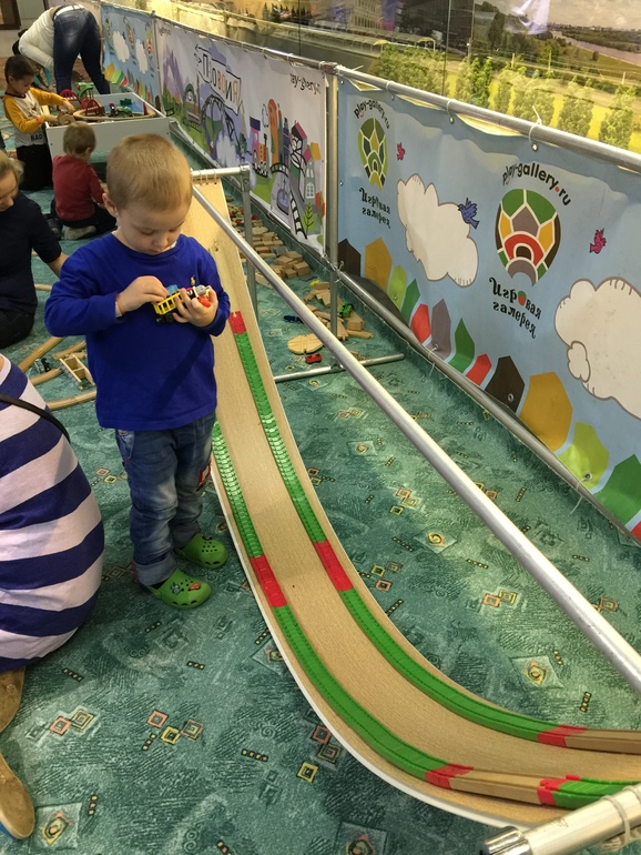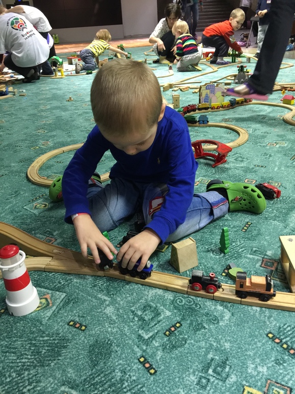 Игровая зона расположена на нижнем уровне музея. Как говорят организаторы, железная дорога занимает площадь 150 квадратных метров - думаю, это площадь всего помещения, а непосредственно для игры места все же поменьше. Однако, народу было не очень много, детки играли вполне свободно. Возраст детей в среднем примерно 4-5 лет, но были и годовалые малыши, и пара мальчиков лет 7-8. После обеда народа стало заметно меньше))
