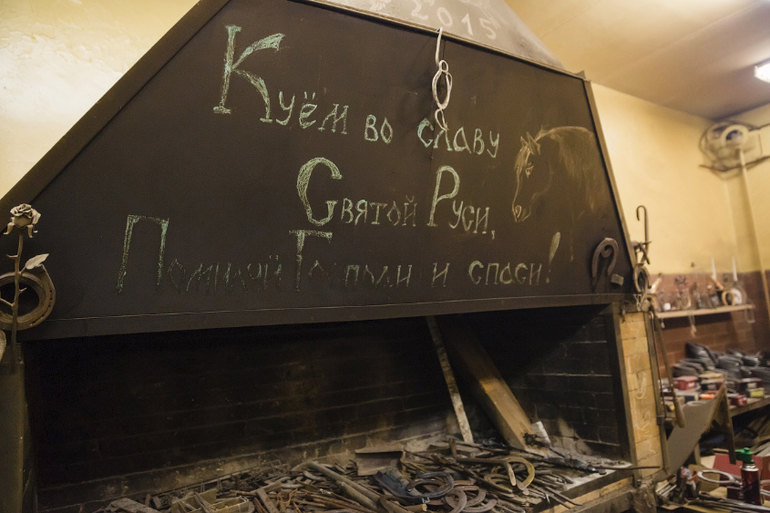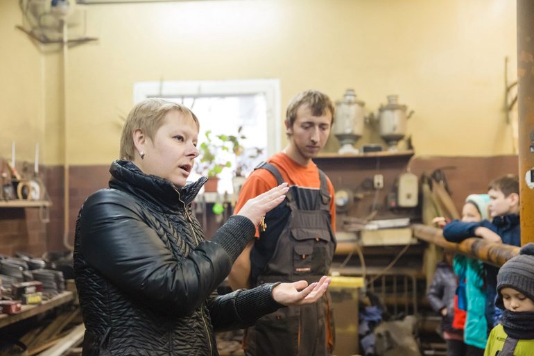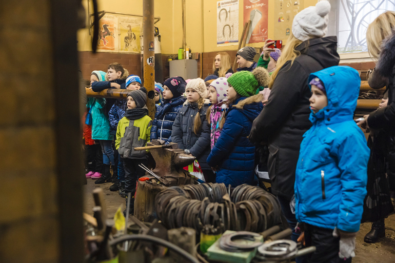 Наш экскурсовод рассказывает о стоимости одной подковы (4 тыс руб) и рекомендует мальчикам выбирать профессию кузнеца.