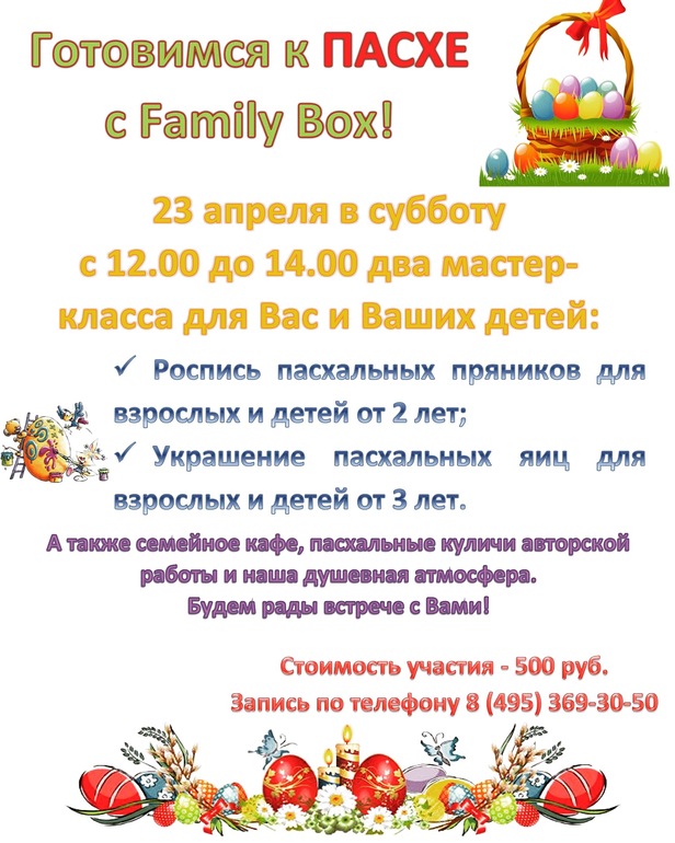 Приглашаем всех 23 апреля с 12 до 14 часов в наш детский центр на увлекательные мастер-классы: Готовимся к Пасхе! В программе роспись пряников и украшение пасхальных яиц лентами. Так же на территории есть кафе где можно вкусно пообедать☕️🍜 по всем вопросам звоните 8-495-369-30-50