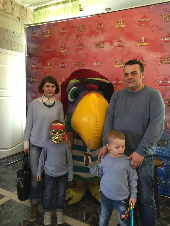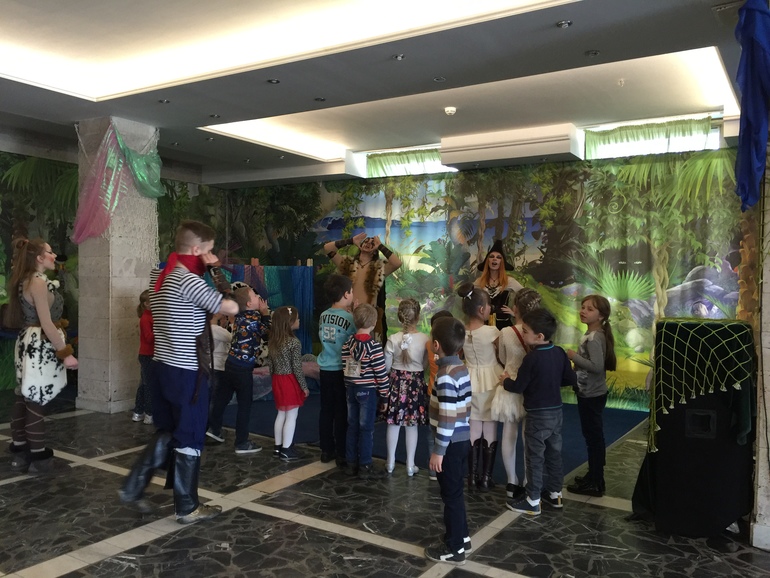первое, что нас удивило ещё на подъезде к театру - большая парковка, которая была практически свободна. А уже внутри нас просто ошарашило обилие развлечений, направленных на выкачивание денег у родителей: аквагрим, сувениры, детский лабиринт, игровые автоматы, фото с ростовыми куклами. Даже наши дети, привыкшие уже обходиться без подобной ерунды, просто очумели от такого разнообразия и выпросили у нас пиратские маски и кинжалы. Из бесплатного - только пиратская анимация до спектакля и в антракте. Анимация была хорошая, но мальчишки участия не принимали, увлёкшись новыми игрушками))
