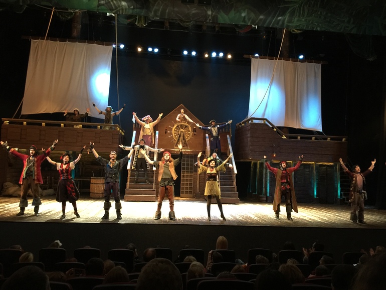 Мюзикл отличный, мы ничуть не пожалели, что сорвались и успели все-таки его посмотреть. Он не так потряс нас, как "Леди совершенство", но вообще он ничем ему не уступает: номера все яркие, музыка задорная, пираты очень колоритные (особенно нам запомнился Черный Пёс), танцы четкие и красиво поставлены, костюмы и декорации отлично передают атмосферу. Мальчик, исполнявший роль Джимми Хоккинса, просто молодец - отыграл весь спектакль наравне со взрослыми, очень артистичный и с великолепным голосом.