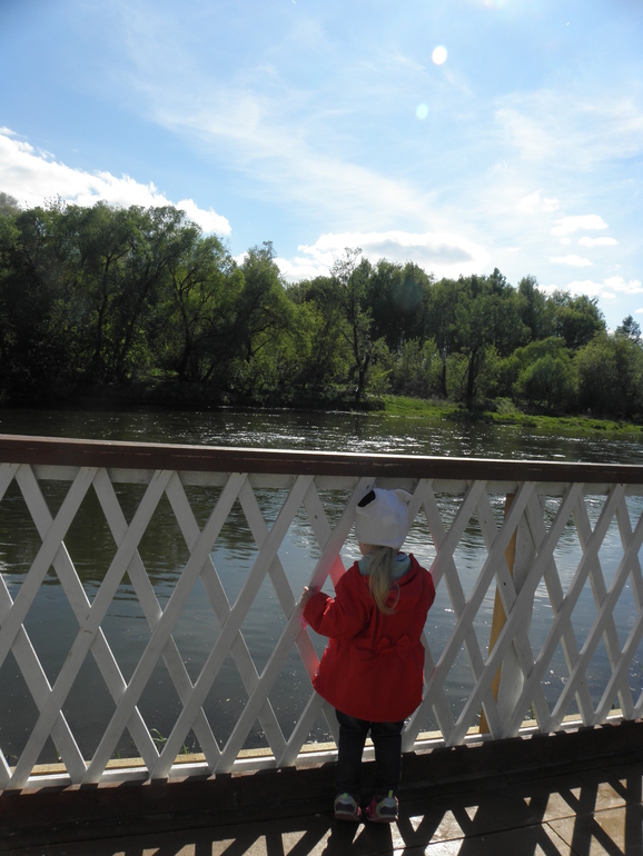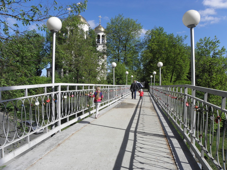 Сразу же с территории церкви мы идем гулять по мостику. Тут тоже возникла традиция вешать "любовные" замки. На фото мы уже обратно возвращаемся из парка (совсем маленький, детская площадка в запустении, можно зайти на минут 10, больше там делать нечего):