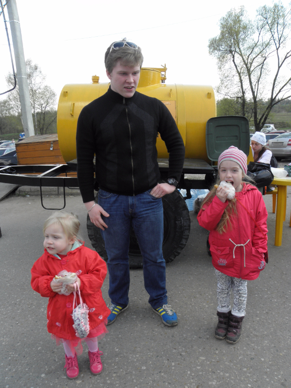 Перед въездом в монастырь в этот раз развернулась целая ярмарка, где продавался и монастырский квас, который наливали из таких бочек. Так же там работает лавка, где можно купить вкуснейших хлеб из гречневой муки, луковый и прочей, очень вкусно) Со старшим братом, дети едят: