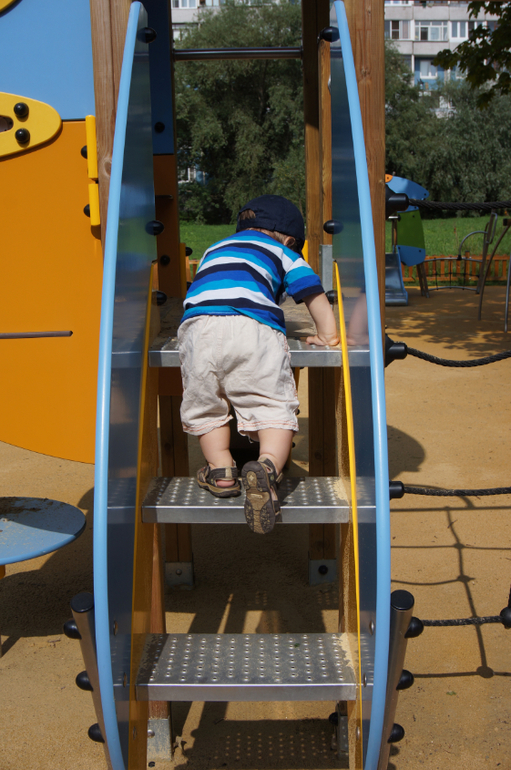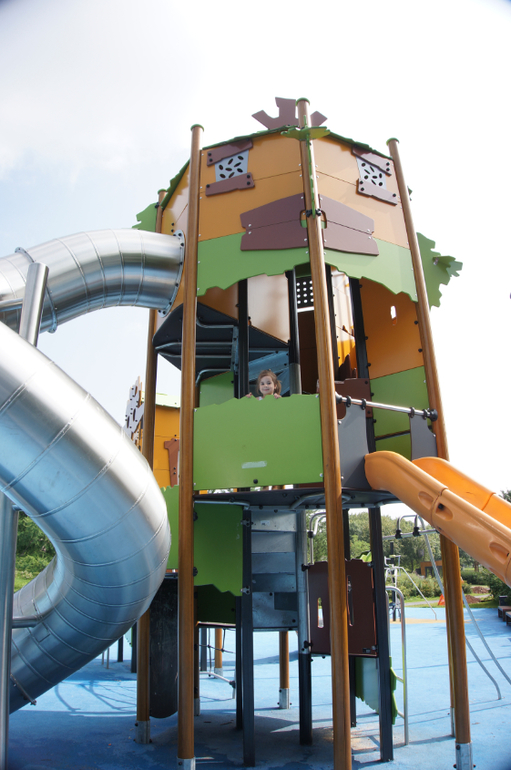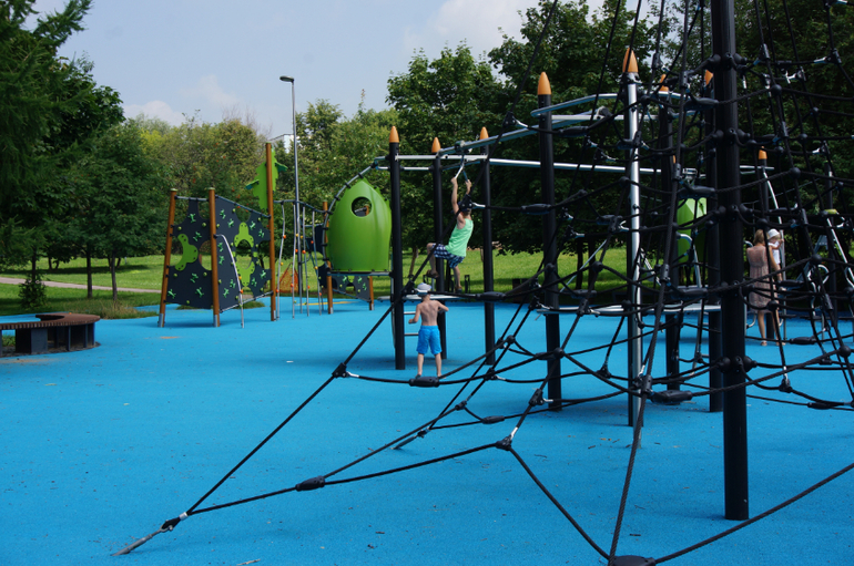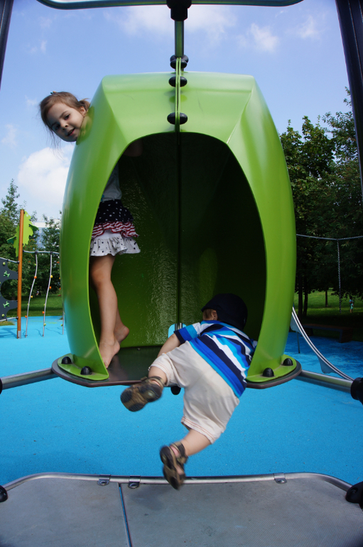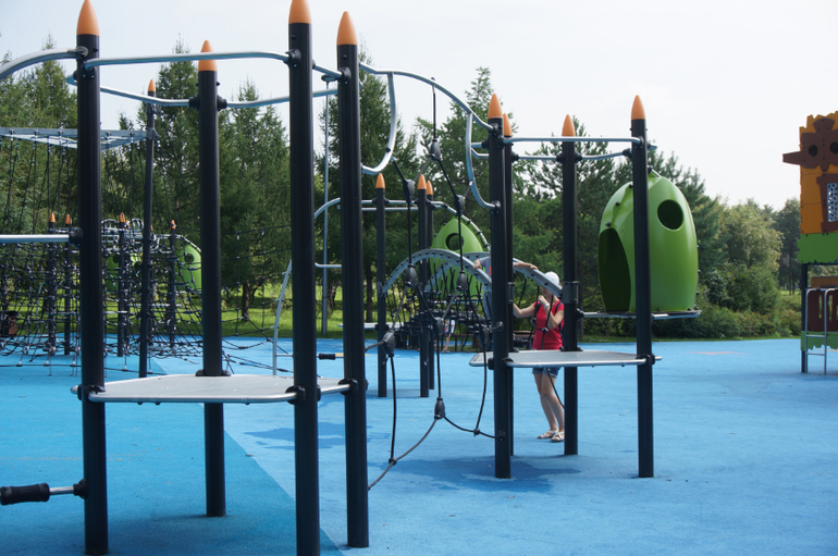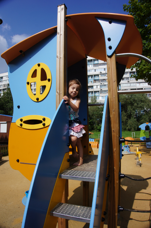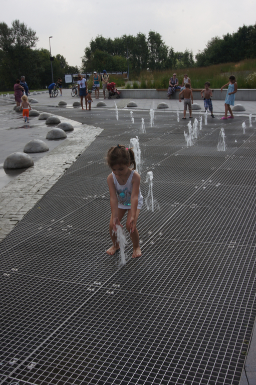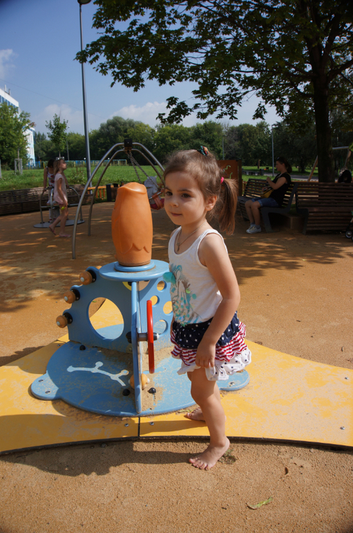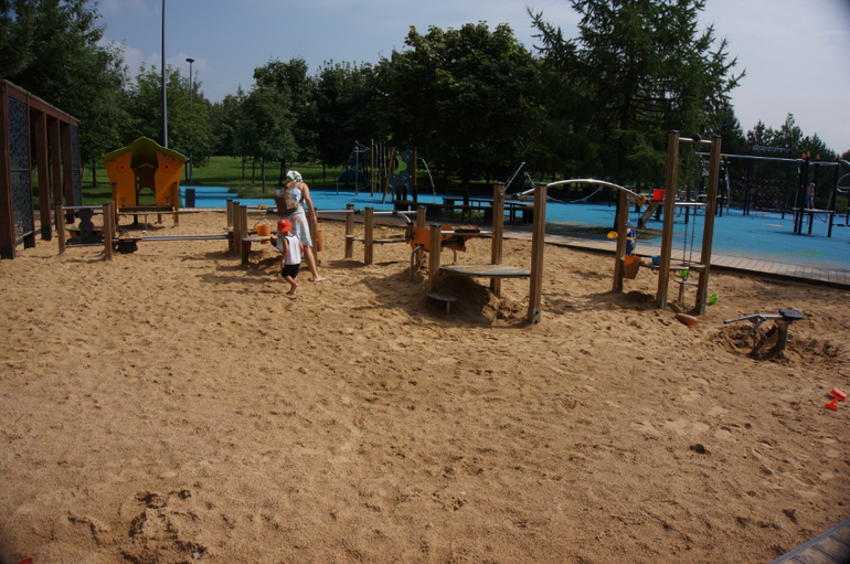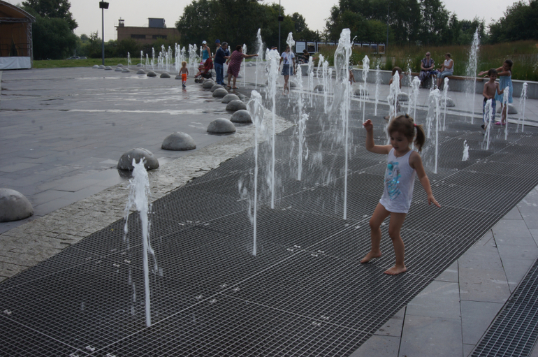 Парк, на мой взгляд, самых оптимальных размеров: детям не надоедает идти, "ножки не устают", тем не менее все площадки больших размеров, никому не скучно, т.к. они по возрастам разные. Очень понравилась малышковая площадка, где детки могут просто ползать: чисто! А уж детям постарше раздолье: хочешь горки, хочешь канатные переправы, лабиринты, и самое "водное" место - фонтан! Вот тут можно застрять на часик-другой, надо не забыть взять сменную одежду и полотенце. Я совершенно не ожидала такого интереса к фонтану, но пришлось поддаться на уговоры Юли и разрешить бегать в трусиках, а обратно ехать только в шортах, искушение фонтаном было сильнее.