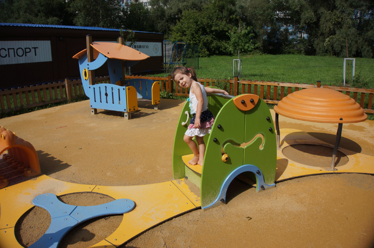 Площадка для деток постарше и огромная песочница с разными игровыми элементами для всех: