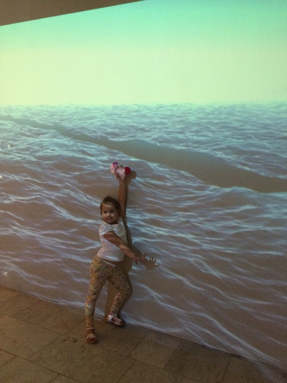При входе висит экран с накатывающими волнами - что позволяет сразу погрузиться в тему. Но ничего сверхъестественного) Или мы избалованы Живыми полотнами и пр интерактивными выставками))) Он на фото: