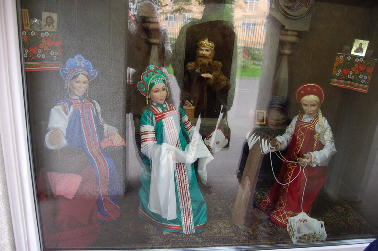 По всему периметру парка расположены маленькие домики, разные по дизайну и очень не обычные. В этих домиках за стеклом оживают сказки А.С. Пушкина. Дети быстро понимают, что находящуюся около стекла большую желтую кнопку надо нажать, чтобы сказка ожила (включается свет и фигурки начинают говорить, раскрывая при этом рты, двигая руками или головами). В домиках оживают все сказки А.С. Пушкина, в том числе и "Сказка о попе и работнике балде", Черномор. Ниже фотографии домика трех сестер из "Сказки о царе Салтане"