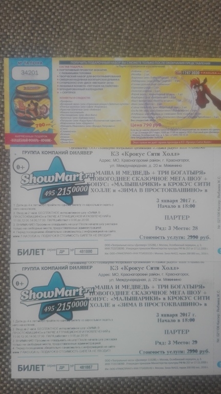 Продаем два билета на Новогоднее представление «Маша и медведь+Три Богатыря». Новогоднее сказочное мега шоу + бонус: «Малышарики» и «Зима в Простоквашино»